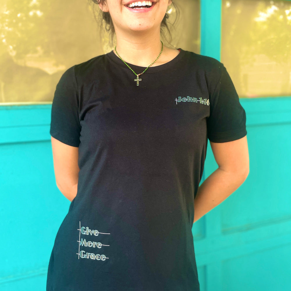 The foundation that forms Christianity is based upon the unending grace that God gives us as we attempt to navigate this difficult life. This women's Christian shirt is a constant reminder that Jesus is sufficient and gives us all grace upon grace upon grace...